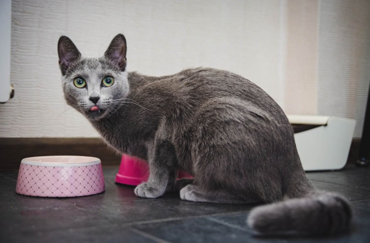 Русская голубая кошка ест