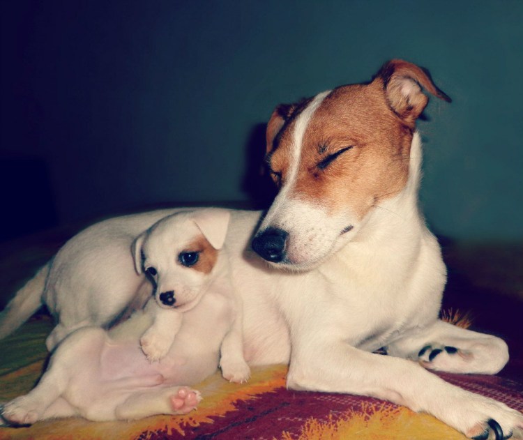 ![Фото с щенком Джек Рассел терьер который пьет молоко у матери]()