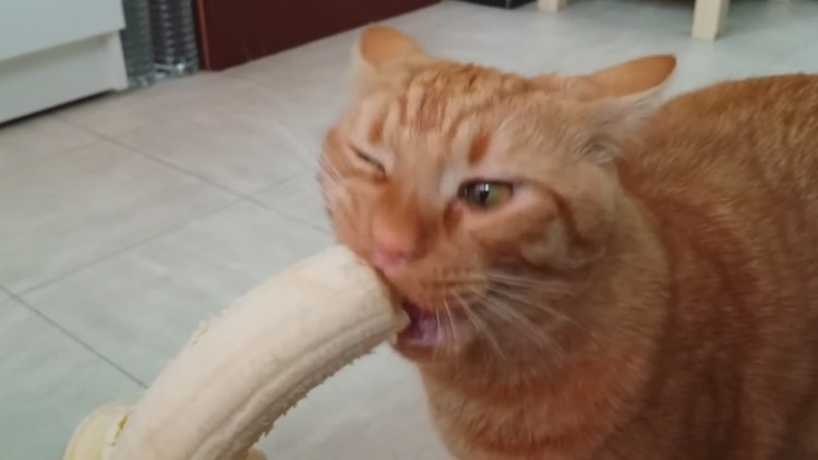 Кот лижет банан