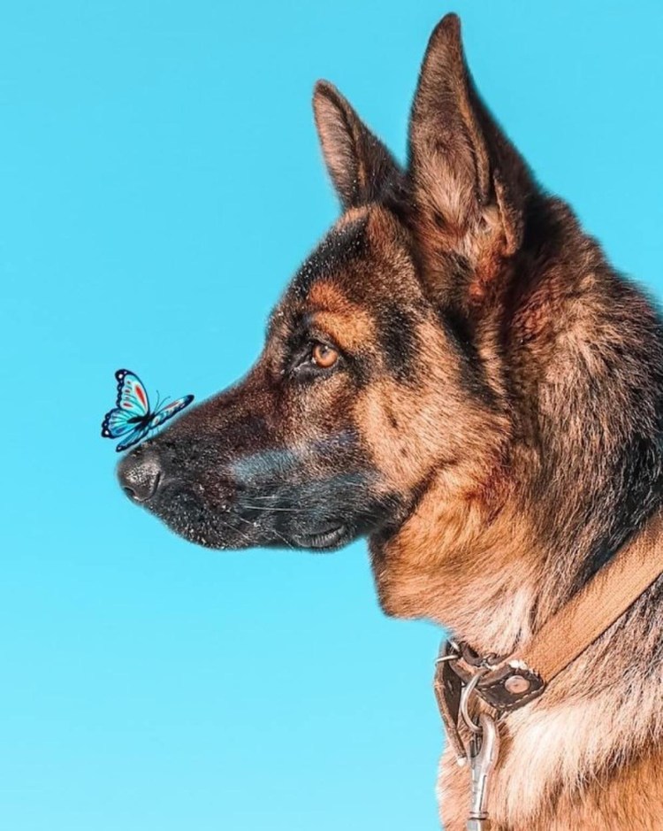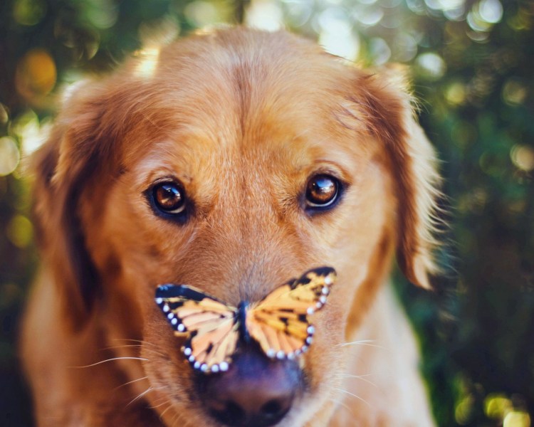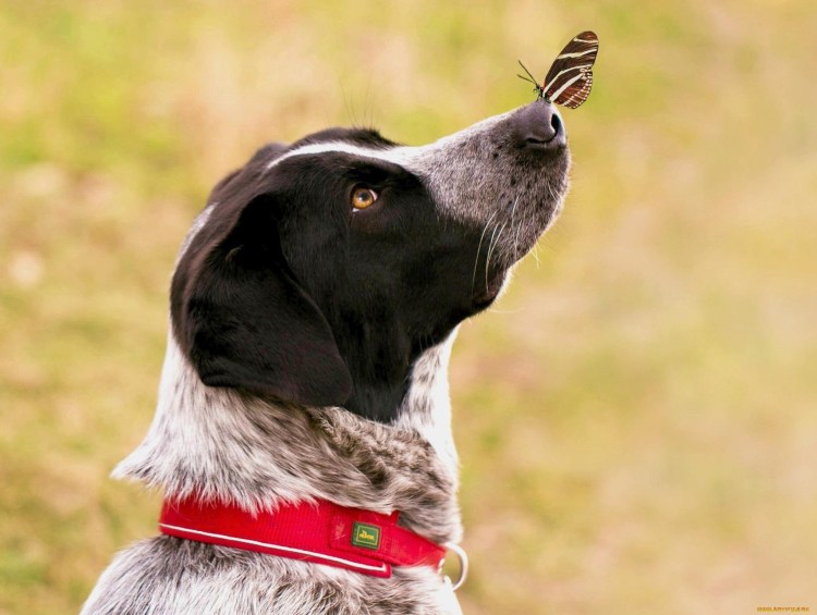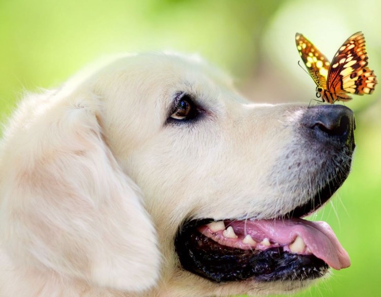 ![Бабочка сидит на носу у собаки]()