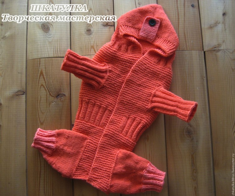 ![Вязаный комбинезон для собаки спицами]()