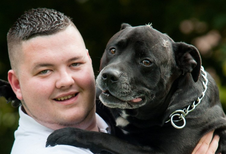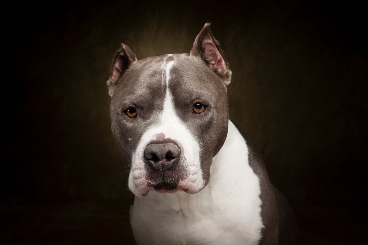 Фото питбуля на черном фоне на цепи с человеком