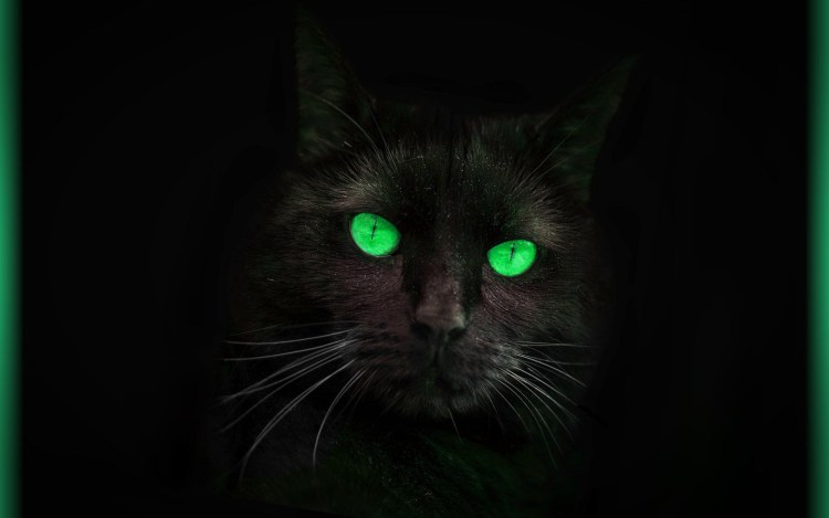 ![Зеленые кошачьи глаза на черном фоне]()