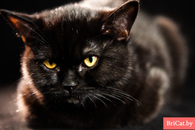 ![Шотландская прямоухая кошка черная глаза желтые]()