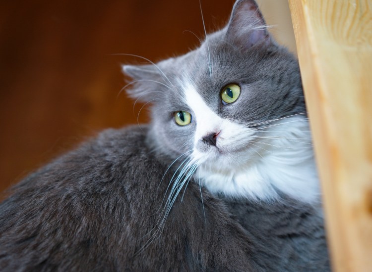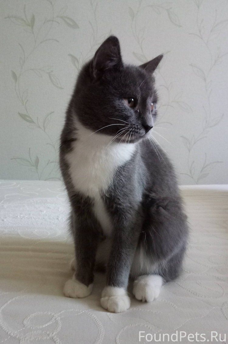 ![Серая дымчатая пушистая кошка с белыми носочками]()