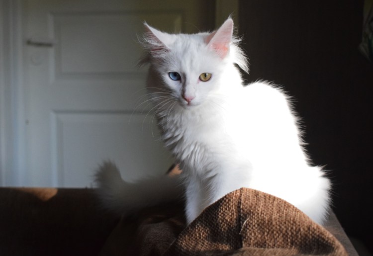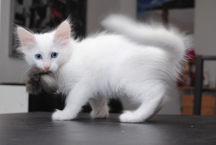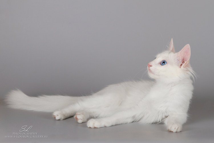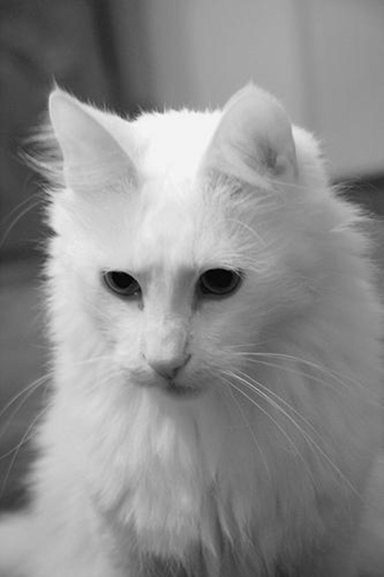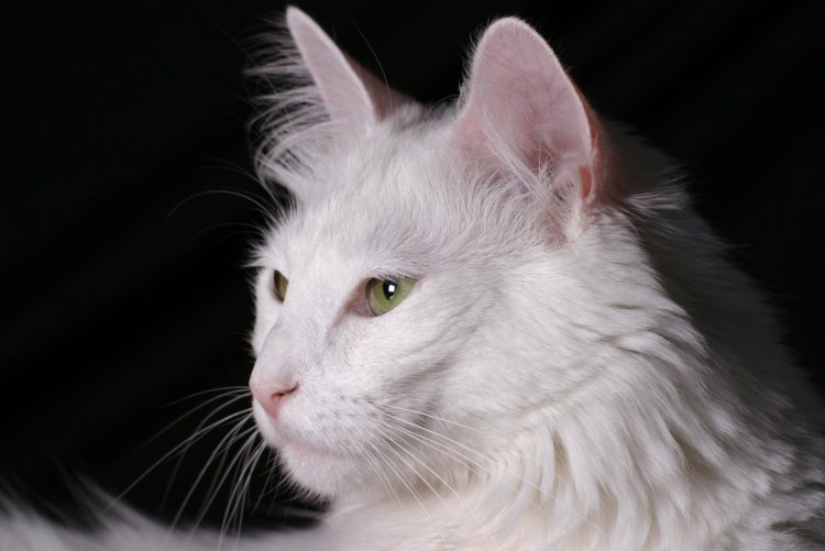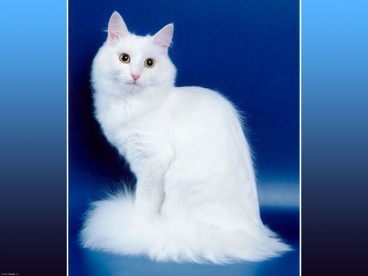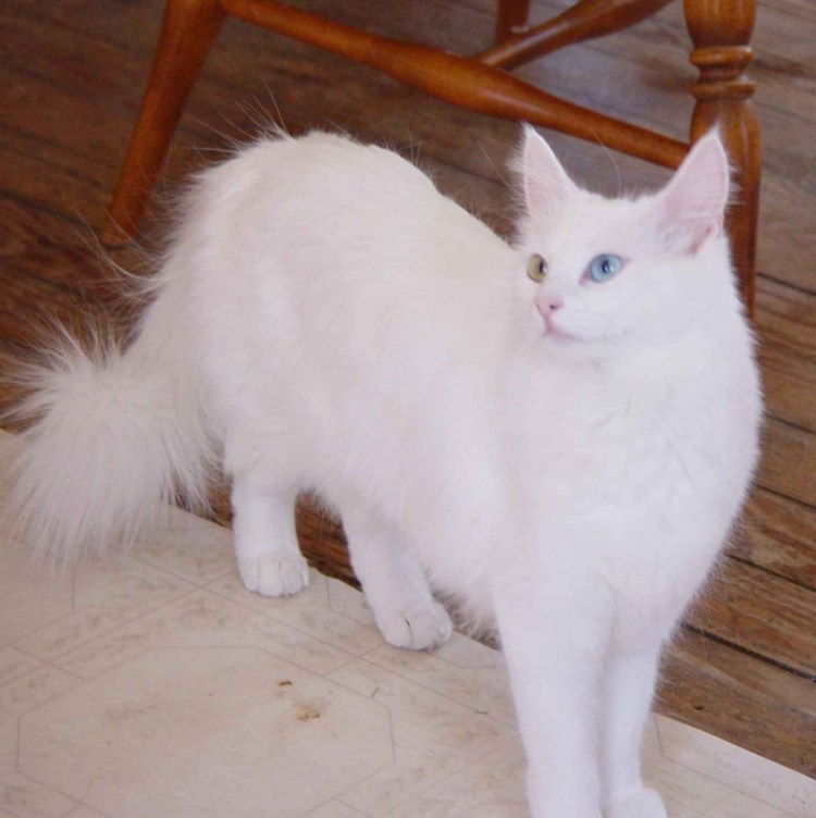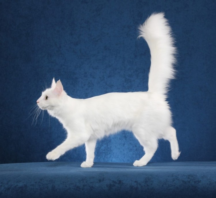 Белый длинношерстный кот с черным хвостом и с черными ушами