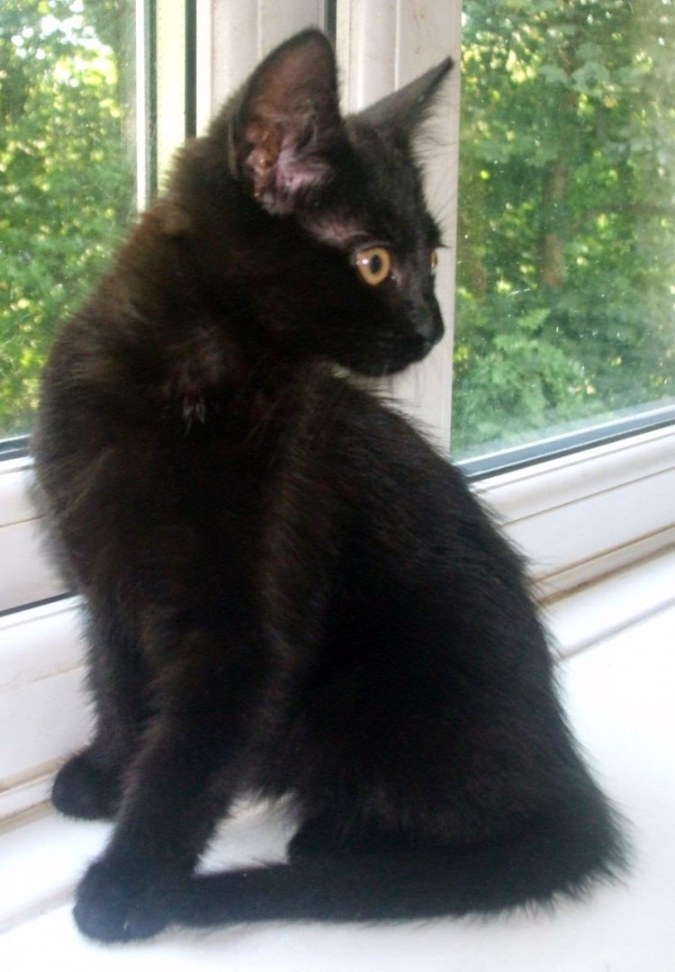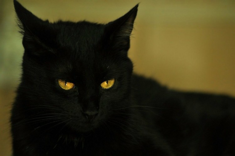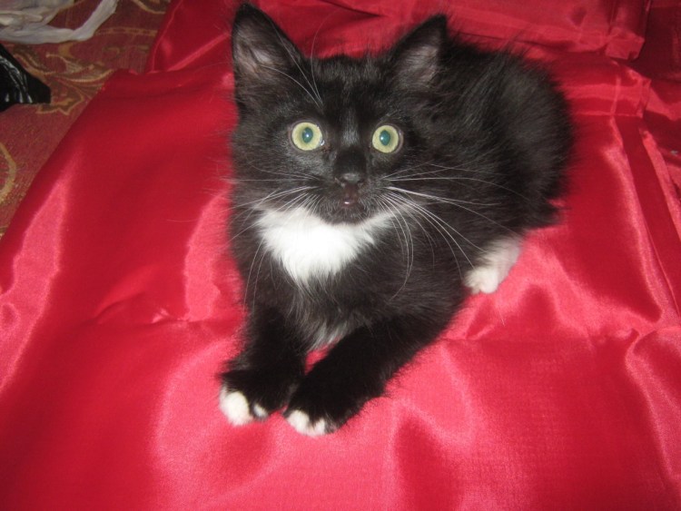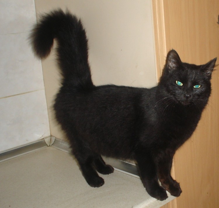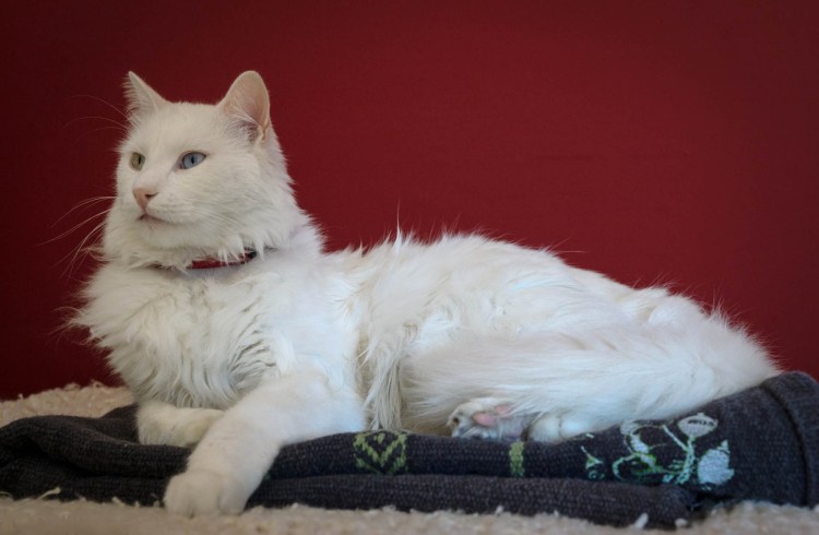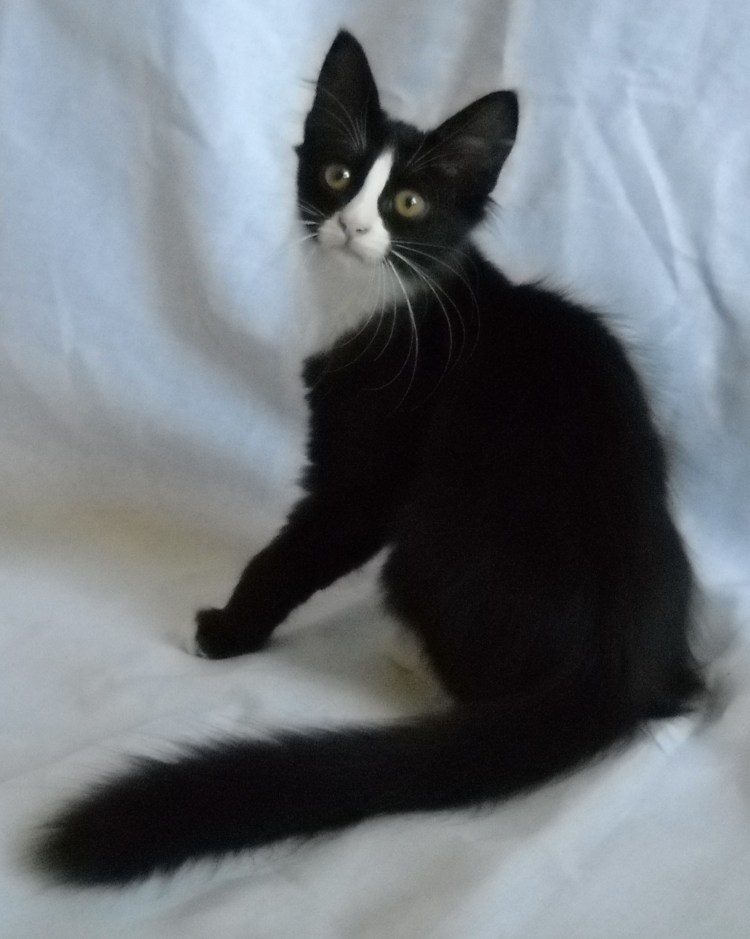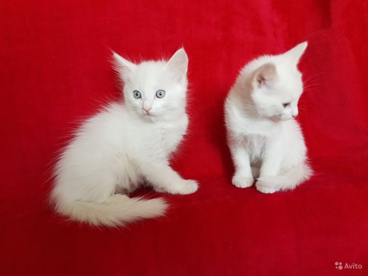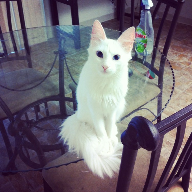 Белый длинношерстный кот с черным хвостом и с черными ушами