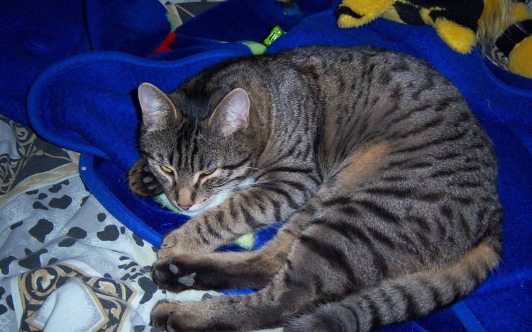 ![Полосатый кот спит]()
