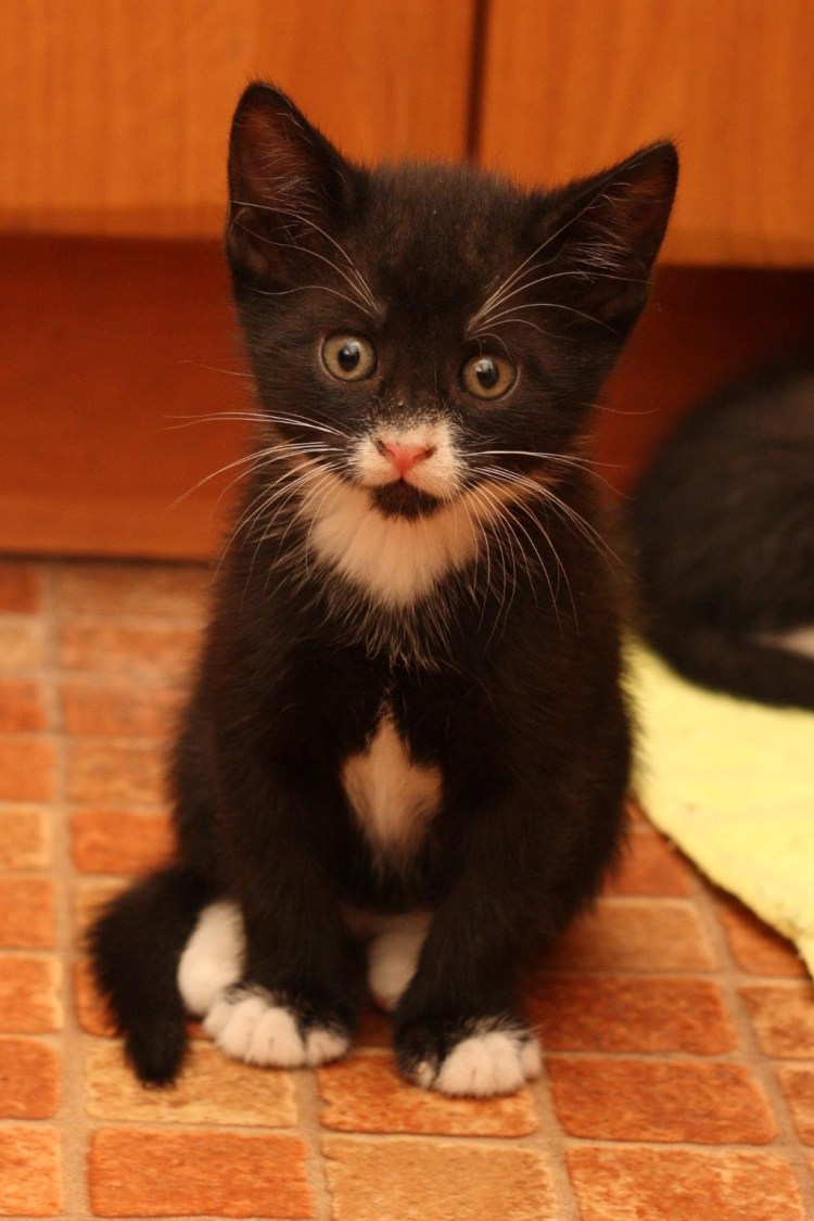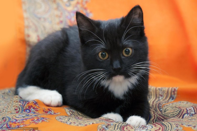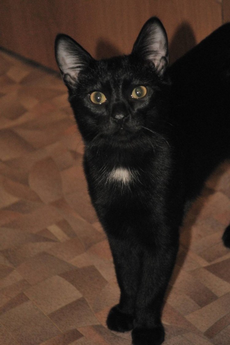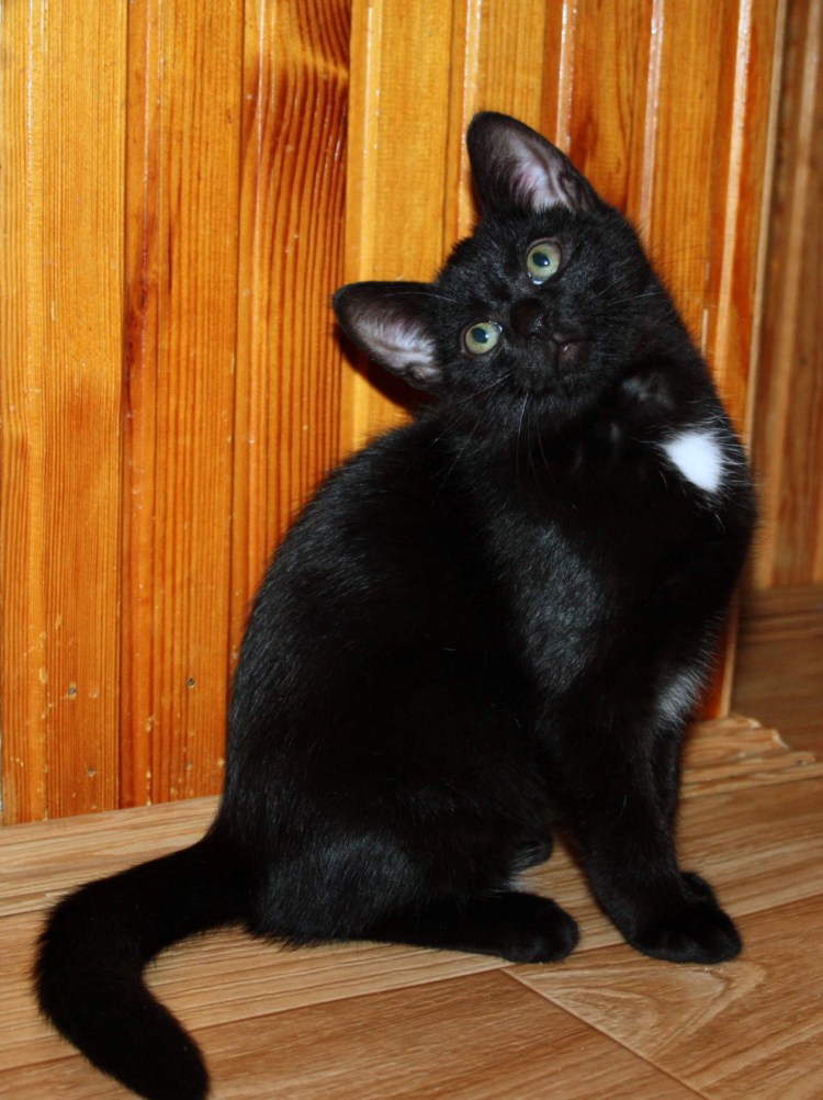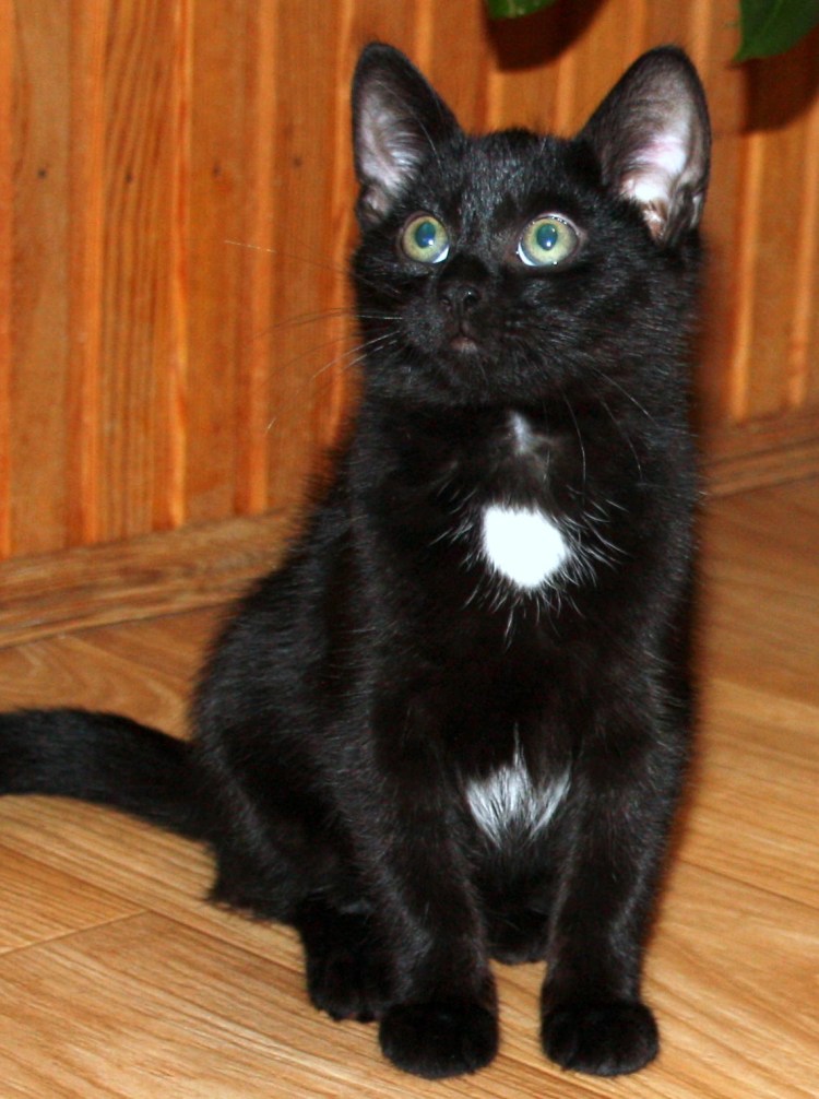 Черный котенок с белой грудкой