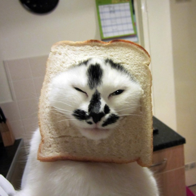 ![Котик с хлебом на голове]()