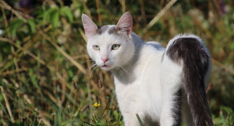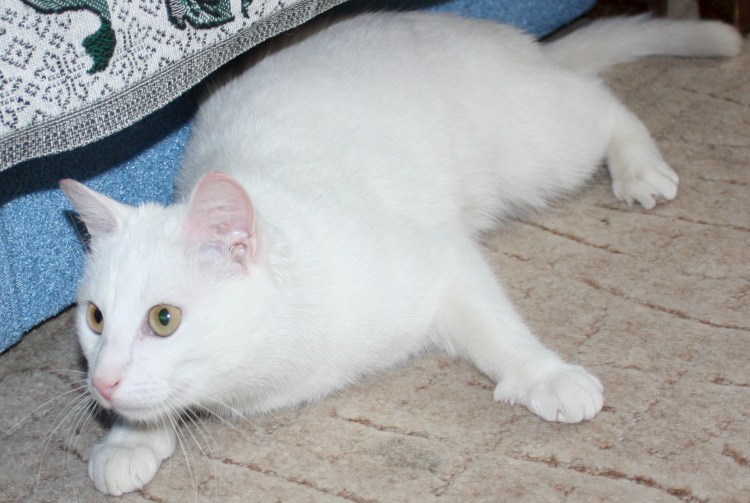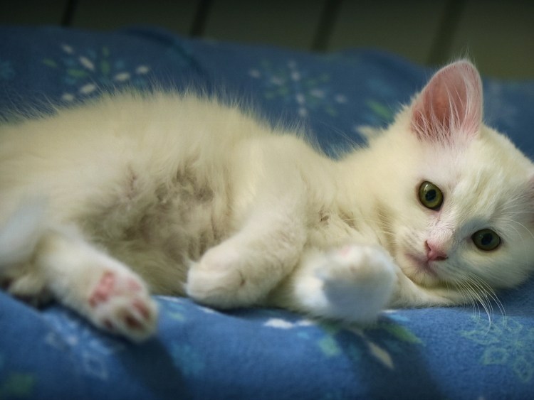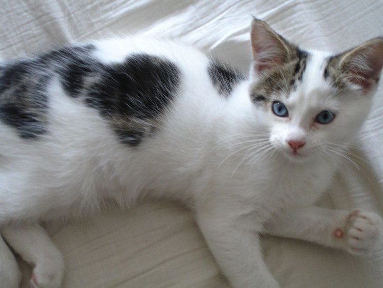![Серенький с белым котёнок с оранжевыми глазками]()